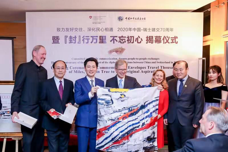 12月19日,中丝集团党委书记、董事长王波参加在瑞士驻华大使馆举办的中瑞建交70周年相关庆祝活动,并向瑞士驻华大使罗志谊等贵宾赠送了由中国和瑞士两国艺术家共同创作的精美丝巾。